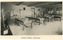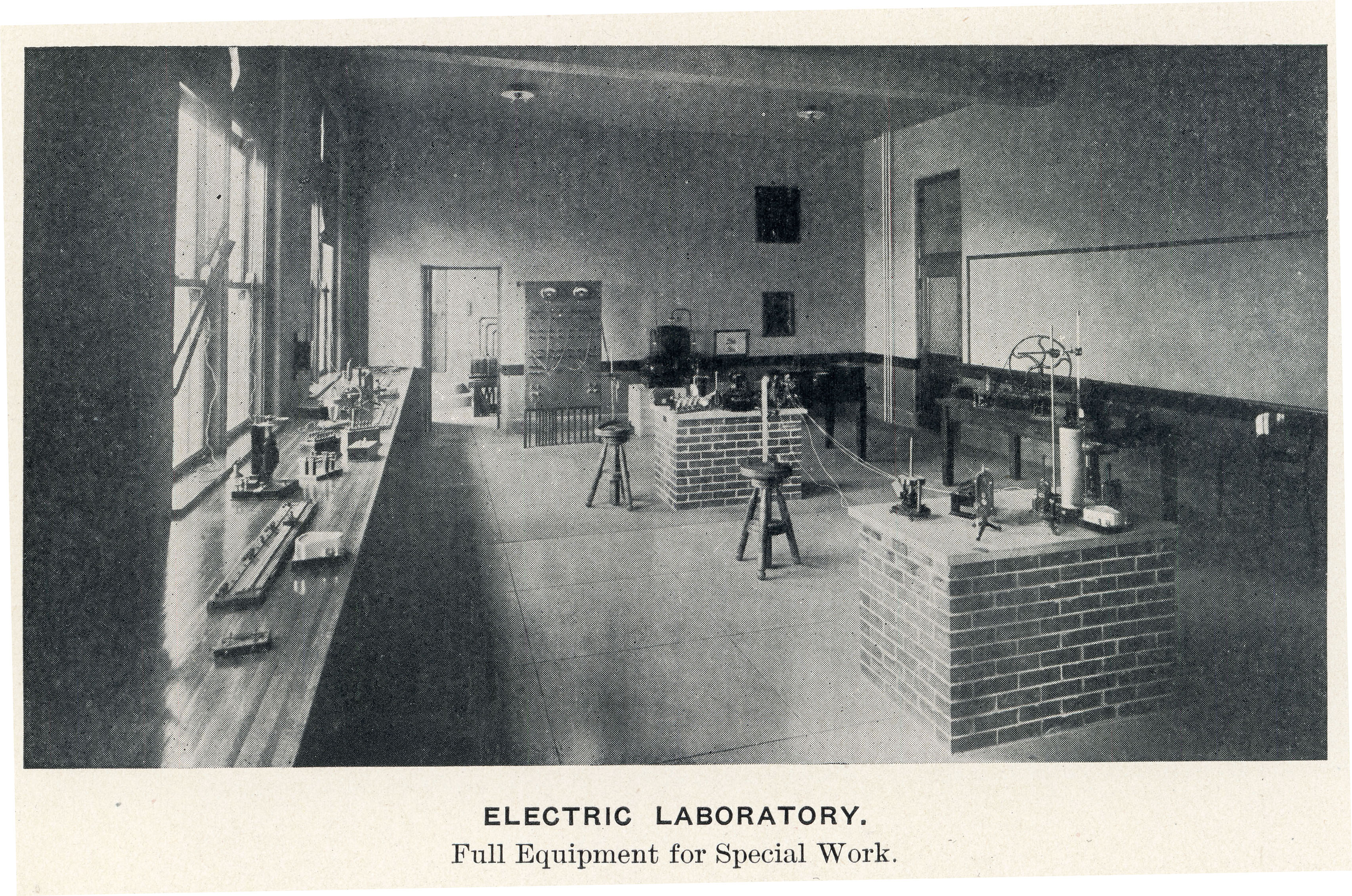The 1908 Old Gold yearbook includes a 10-page essay with photographs which describes the new building’s layout and equipment. The first level was occupied by the geography faculty. The second level included physics laboratories, with a general laboratory, advanced mechanical laboratory, electrical laboratory, light and sound laboratory, and photographic laboratory. The third level, which physics shared to a limited extent with chemistry, included classrooms, offices, and an apparatus room. The fourth level was devoted to chemistry, including a nicely equipped classroom, general and qualitative analysis laboratory, and quantitative laboratory.