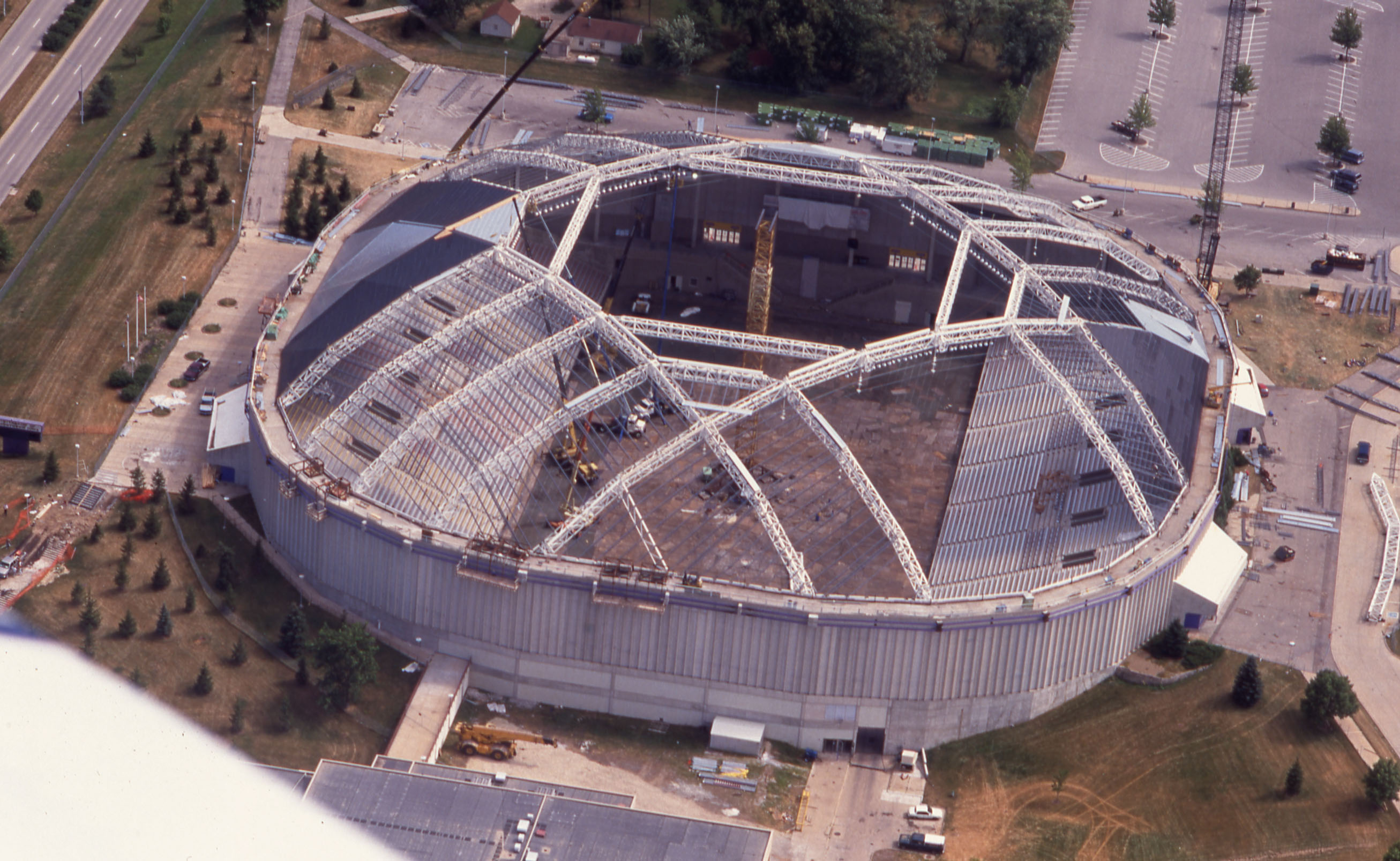 Construction started in fall 1997 with exterior work on strengthening the outer ring to support the heavier roof. Penn-Co Construction Company was the general contractor for the roof project. On March 23, 1998, the Dome was deflated for the last time to allow construction to begin on the roof itself. Most of the old roof fabric went to the Bremer County landfill to be used to cover refuse. The new "hybrid" roof would consist of two parts. The lower section would have an external finished surface of stainless steel. The translucent center portion would be Teflon-coated fiberglass. This center portion, or skylight, would comprise about 45,000 of the 160,000 square feet of roof. The project, including interior modifications and remodeling, was budgeted at $11.8 million. The facility was set to be ready for the September 10, 1998, football game against McNeese State.
