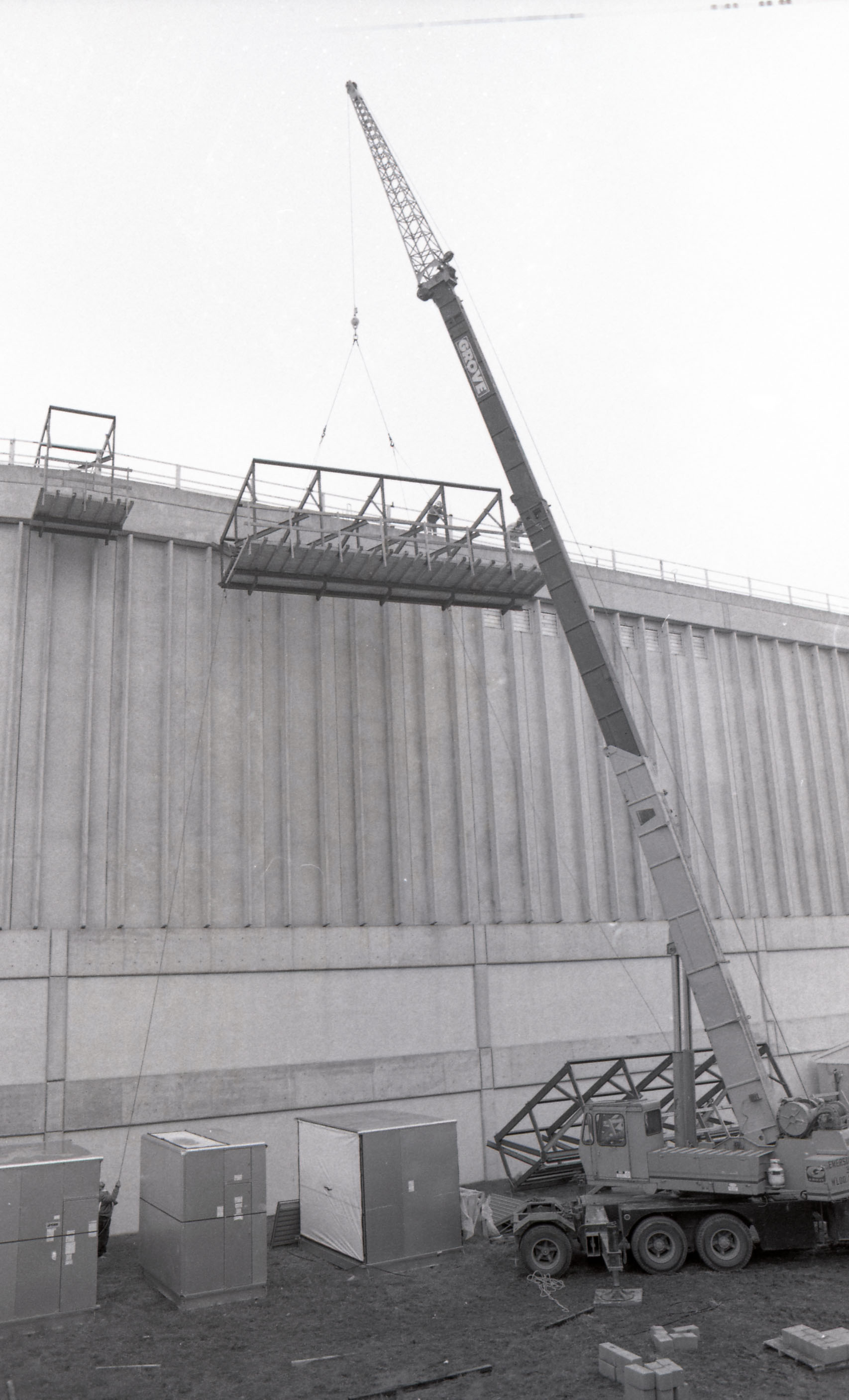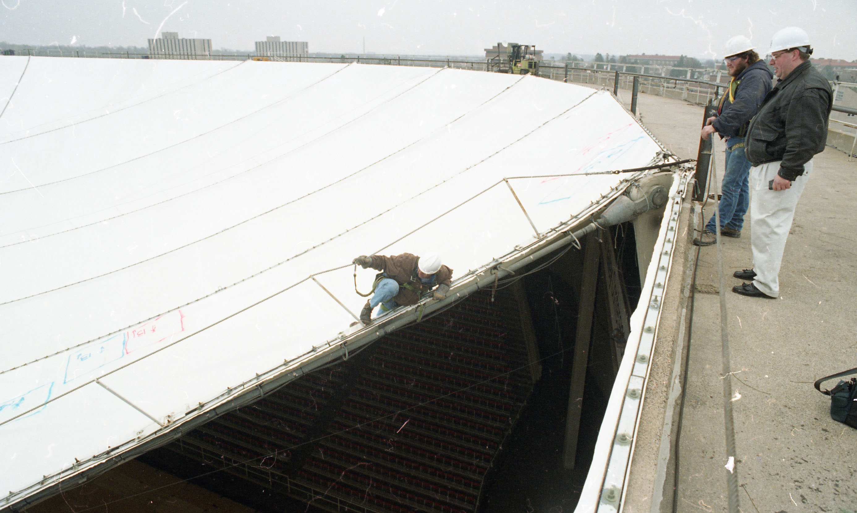 In 1979, a guard rail was installed around the Dome’s high exterior walkway where the inflatable roof met the concrete ring. Members of Local 2659 of the American Federation of State, County, and Municipal Employees had complained the situation was dangerous for employees who were required to go onto the inflatable roof to remove snow. Consequently, the Iowa Occupational Safety and Health Administration ordered installation of the safety measure.